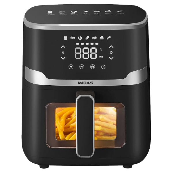 5,5 Litros reales - Diseño exclusivo con Visor que permite evitar aberturas innecesarias. - Color: Negro. - Controles analógicos de larga duración. - Configurable entre 80° y 200° centígrados - Configurable de 1 minuto de uso hasta 60 minutos. - 1350 watts - Base antiadherente de fácil limpieza. - 220 V - Sin fijaciones aparentes (remaches, tornillos, clips, etc.)