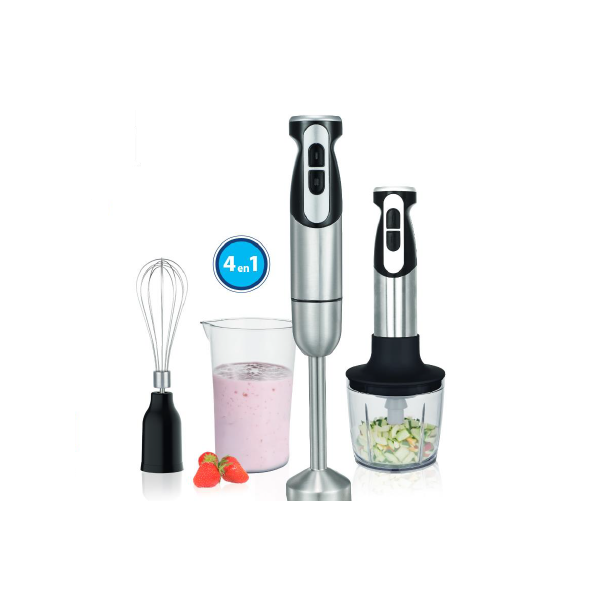 Pulsador con 2 velocidades - Superficie de Acero Inoxidable, resistencia añadida ante golpes y caídas. - 800 WATTS de Potencia, para preparaciones de gran volumen. - Potencia de Salida Máxima 800W - Potencia de Entrada máxima 1000W - Accesorios: Picador de Verduras, Batidora, Vaso para Salsas. - Voltaje 220-240V~/50Hz. - 4 cuchillas para un funcionamiento óptimo. - Fácil de Desmontar y Limpiar. - Brazo Cortador/Mixeadorde Acero Inoxidable Dimensiones - Producto: 51.7 X 205 mm/1.14kg - Caja:385 x 140 x 265mm/2.9kgPREPARACIÓN