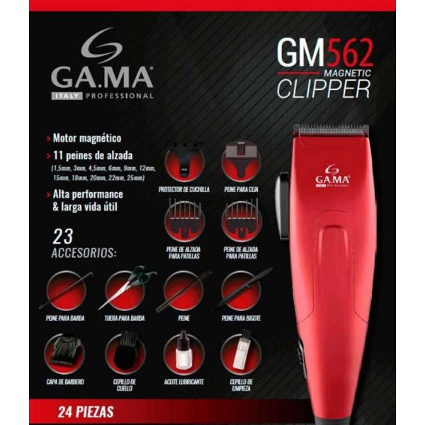 - Clipper Magnético GM 562 de 24 piezas. Cuenta con 11 peines de alzada: 1,5 / 3 / 4,5 / 6 / 9 / 12 / 16 / 18 / 20 / 22 / 25,4.
