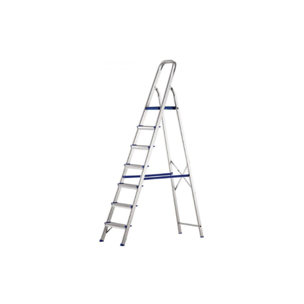 Escalones antideslizante. - Traba automática en el escalón superior. - Barandilla alta y segura. - Aluminio de aleacion especial. - Super resistente 120kg. - 7 peldaños. - Medidas 155cm.