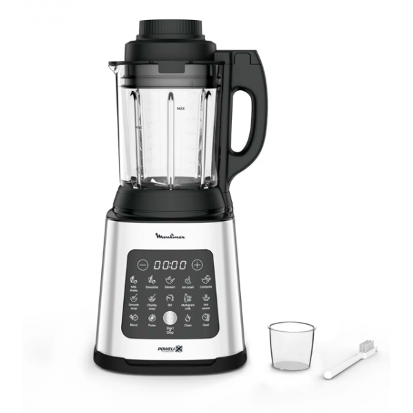 10 programas automáticos para recetas frías (smoothies, batidos, postres, hielo picado) y calientes (sopas suaves y con textura, compota, bebida vegetal, salsas y recalentar). - Motor de alta velocidad de 1400 W con cuchillas exclusivas Powelix que ofrecen performance más rápida y eficiente. - Jarra de 2 L de vidrio termorresistente (aprox. 1,75 L útil), adecuada para preparar porciones familiares o para invitados. - Sistema de ventilación inteligente evita sobrecalentamiento y prolonga la vida útil del motor; acabados metálicos y panel táctil intuitivo. - Acceso gratuito a más de 300 recetas desde la app de Moulinex para aprovechar todas las funciones. - Cuchillas desmontables y función automática de limpieza profunda. - Accesorios incluidos: Vaso medidor y cepillo para limpieza.